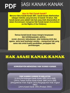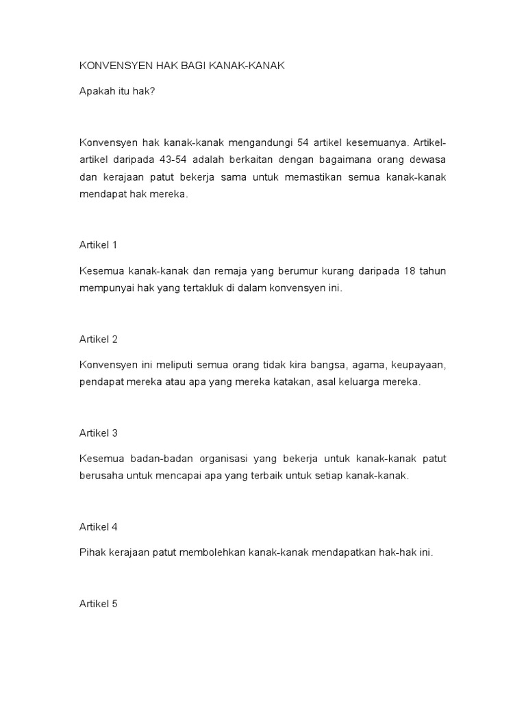 Hak asasi kanak kanak konvensyen mengenai hak kanak kanak hak asasi kanak kanak konvensyen mengenai hak kanak kanak. Konvensyen mengenai hak kanak kanak atau crc mempunyai 54 perkara dan dapat dibahagikan kepada 3 bahagian iaitu bahagian i perkara 1 41 bahagian ii perkara 42 45 dan bahagian iii perkara 46 54. Konvensyen hak kanak kanak mengandungi 54 artikel kesemuanya.
