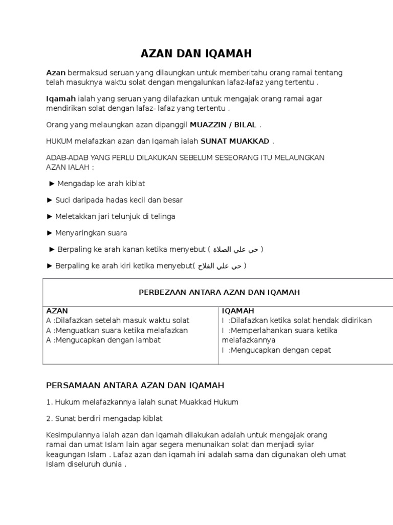 Menguman dangkan azan dan iqamah kompetensi dasar 5 1 melafazkan lafaz azan dan iqamah 5 2 menguman dangkan azan dan iqamah indikator 5 1 1 menirukan lafaz azan dan iqamah 5 1 2 melafazkan lafaz azan dan iqamah 5 1 3 mendemonstrasikan lafaz azan dan iqamah 5 2 1 menyebutkan urutan lafaz azan dan iqamah 5 2 2. Iqamah ini adalah sebuah pemberitahuan kepada para jamaah shalat yang telah mendatangi masjid atau mushalla atau tempat shalat yang lain untuk menyegerakan dirinya bangun dari duduknya dan berdiri untuk bersiap siap menjalankan ibadah shalat. Nah itulah lafadz ketika kita mendengar suara adzan dan iqamah yang yang dapat saya bagikan dalam kesempatan kali ini untuk para shahabat jika ada yang masih binggung dengan pembahasan di atas silahkan tuliskan di kolom komentar tentang hal apa yang para shahabat bingungkan dan untuk penulisan artikel kali ini saya cukuipkan sampai disini akhir kata saya ucapkan wasallam baca juga artikel.
