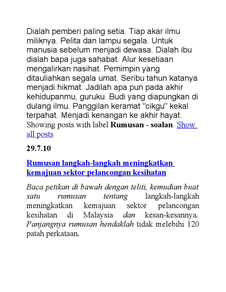 Kesimpulannya terdapat pelbagai langkah yang dapat dirancang dan dilaksanakan untuk meningkatkan sektor pelancongan di negara kita. Bhoshaga spm 2016 10a is offering bm tuitions for spm 2020 students who are in form 4 form 5 only. Penyediaan hotel chalet tandas pengangkutan bekalan air dan elektrik adalah penting untuk pembangunan.
