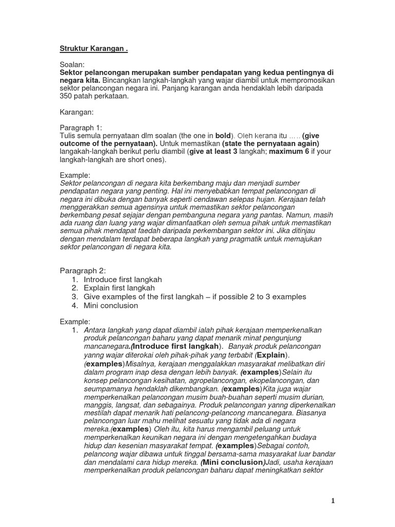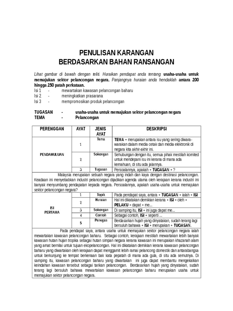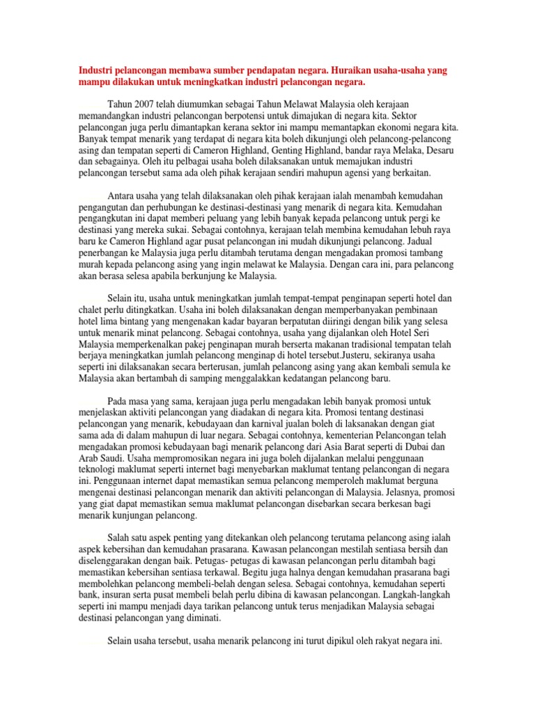 Langkah memajukan sektor pelancongan. Ipendidikan karangan usaha dan langkah memajukan sektor pelancongan di malaysia disemak dan dikemaskini pada pukul 3 50 pm 3 julai 2020 terdapat pelbagai kaedah dalam memastikan pelajar menguasai penulisan karangan bahasa melayu antaranya adalah dengan melakukan latihan tambahan. Pendapatan indsutri pelancongan mencatatkan peningkatan 7 2 peratus dengan nilai rm103 3 bilion pada tahun 2013 dalam menjana ekonomi malaysia kata timbalan perdana menteri tan sri muhyiddin yassin. Kerajaan telah menggerakkan semua agensinya untuk memastikan sektor pelancongan berkembang pesat sejajar dengan pembanguna negara yang pantas.