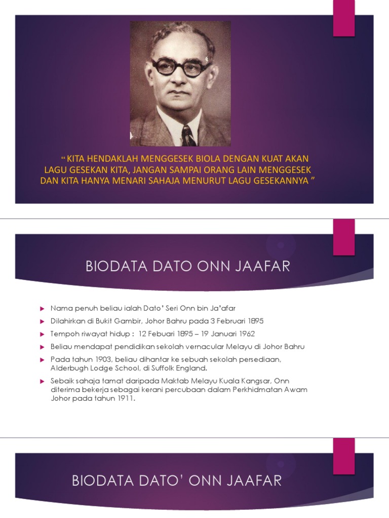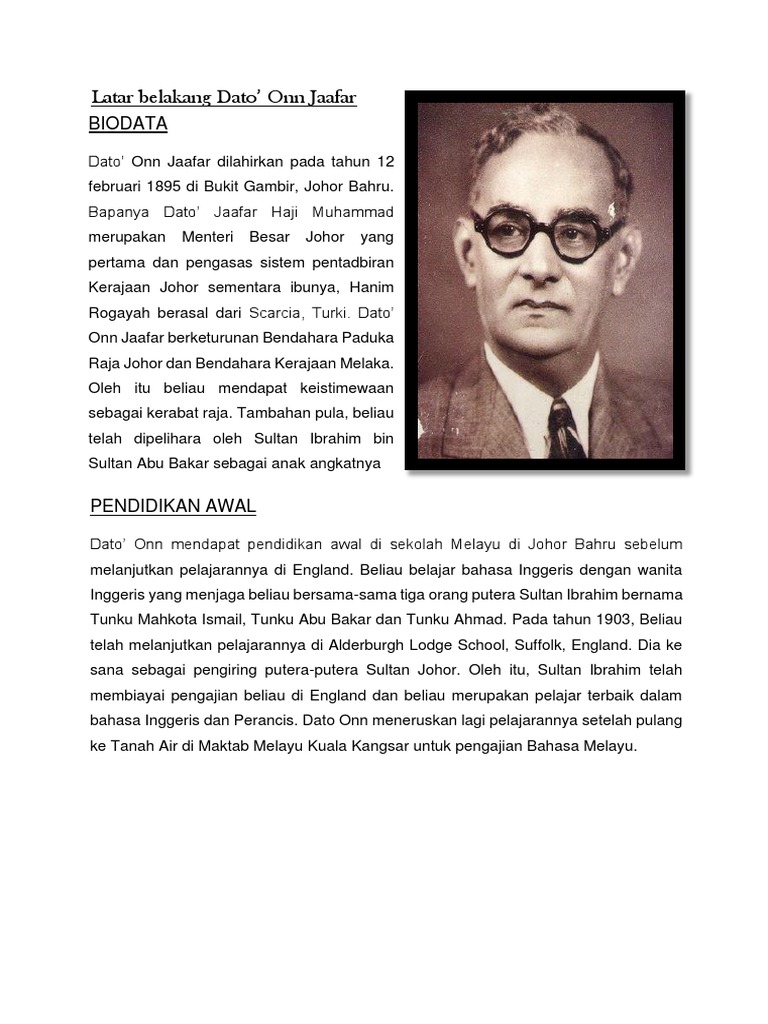 Dato onn jaafar dilahirkan di seri gambir jalan gertak merah johor bahru pada 12 februari 1895 serta merupakan anak kepada datuk jaafar bin haji muhammad menteri besar johor yang pertama. Sedar penyatuan rakyat perlu bermula dengan kesedaran rakyat mengiktiraf antara satu dan yang lain tanpa mengambil kira latar belakang yang berbeza. Dato sir onn bin dato jaafar 12 february 1895 19 january 1962 was a malayan politician who served as the 7th menteri besar of johor from 1947 to 1950 then malaya now malaysia he is also the founder and was the 1st president of united malays national organisation umno from its formation in 1946 to his resignation in 1951 and was also responsible for the social and economic welfare.