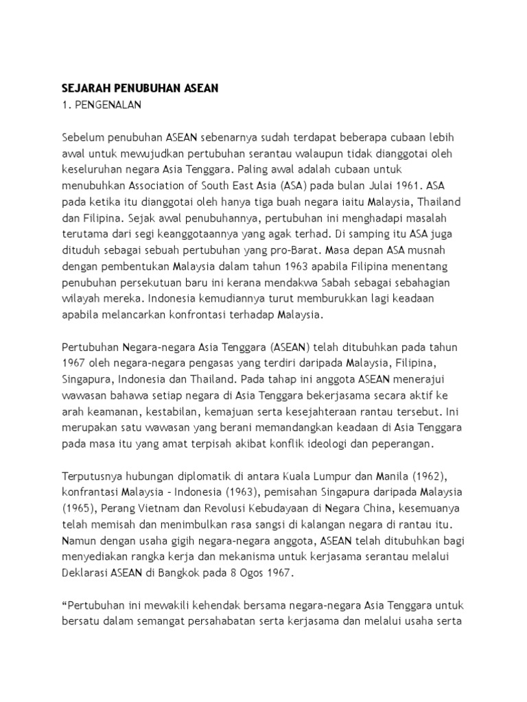 Asean dikukuhkan oleh lima negara pengasas. Indonesia malaysia filipina singapura dan thailand di bangkok proses pembentukan asean dibuat dalam sebuah penandatanganan perjanjian yang dikenal dengan nama deklarasi bangkok. Deklarasi asean atau deklarasi bangkok ialah dokumen pengasas persatuan negara negara asia tenggara asean.