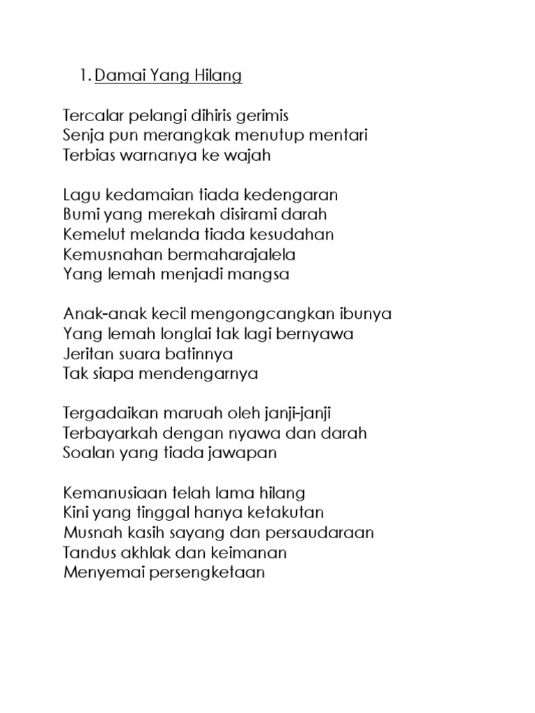 Lirik damai yang hilang. Tercalar pelangi di hiris gerimis senjapun merangkak menutup mentari terbias warnanya ke wajah. Yang lemah menjadi mangsa anak anak kecil mengoncangkan ibunya yang lemah longlai tak lagi bernyawa jeritan suara batinnya tak siapa mendengarnya tergadaikah maruah oleh janji janji terbayarkah dengan nyawa dan darah soalan yang tiada jawapan kemanusiaan telah lama hilang kini yang tinggal hanya ketakutan musnah kasih sayang dan persaudaraan. Liriklagu hits lirik lagu terbaru dan hits.