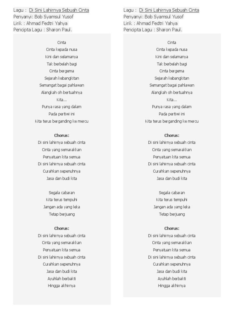 Ahmad fedtri yahya nyanyian. Di sini lahirnya sebuah cinta cinta cinta kepada nusa kini dan selamanya tak berbelah bagi cinta bergema sejarah kebangkitan semangat bagai pahlawan alangkah oh bertuahnya kita punya rasa yang dalam pada pertiwi ini kita terus berganding ke mercu chorus di sini lahirnya sebuah cinta cinta yang semarakkan penyatuan kita semua. Ahmad fedtri yahya nyanyian.