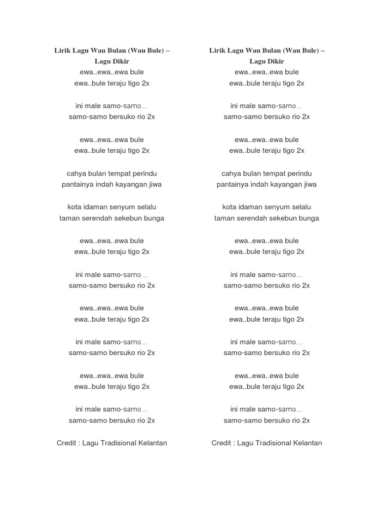Ewa ewa ewa bule ewa bule teraju tigo 2x ini male samo samo samo samo bersuko rio 2x ewa ewa ewa bule ewa bule teraju tigo 2x cahya bulan tempat perindu pantainya indah kayangan jiwa kota idaman senyum selalu taman serendah sekebun bunga ewa ewa ewa bule ewa bule teraju tigo 2x ini male samo samo samo samo bersuko rio 2x ewa ewa ewa bule. Tapi isher ade dapat satu not lagu dari sepupu isher lagu aizat pergi kat bawah nie lah not nyer. Lirik lagu wau bulan wau bule lagu dikir.