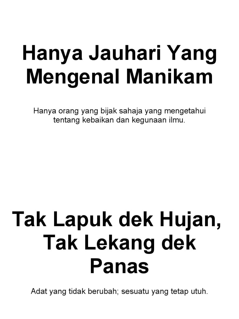Share to twitter share to facebook share to pinterest. Dari peribahasa melayu tak lapuk dek hujan tak lekang dek panas yang diambil bagian pertamanya saja dengan aksen khas sumatra barat padang. Peribahasa peribahasa melayu malaysia.