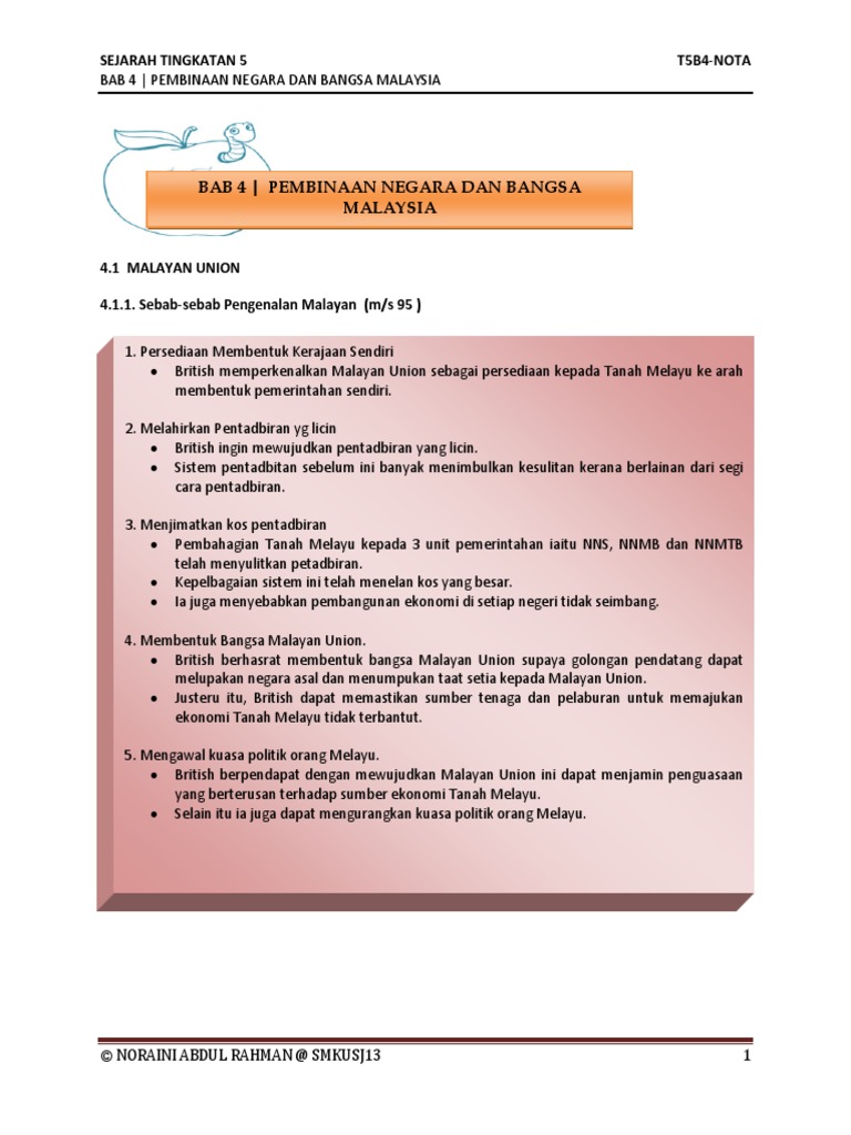 Ulangkaji bab 4 tingkatan 5 malayan union pentin. Pembinaan negara dan bangsa malaysia huraian sukatan pelajaran dan buku teks sejarah tingkatan 5 bab 4 tugasan umum. British memperkenalkan malayan union sebagai persediaan kepada tanah melayu ke arah membentuk pemerintahan sendiri.