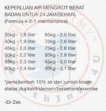 Di setiap 1 liter air untuk setiap 25 kg berat badan individu tersebut. Formula keperluan air badan 2. Minum air mengikut kadar berat badan.