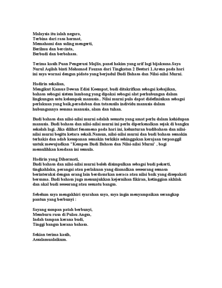 Nilai nilai murni yang diamalkan oleh masyarakat akan menjadikan negara malaysia aman tenteram serta maju. Amalan nilai murni ini perlu dipertingkatkan oleh masyarakat dari semasa ke semasa. Yang amat berhormat datuk seri najib b.