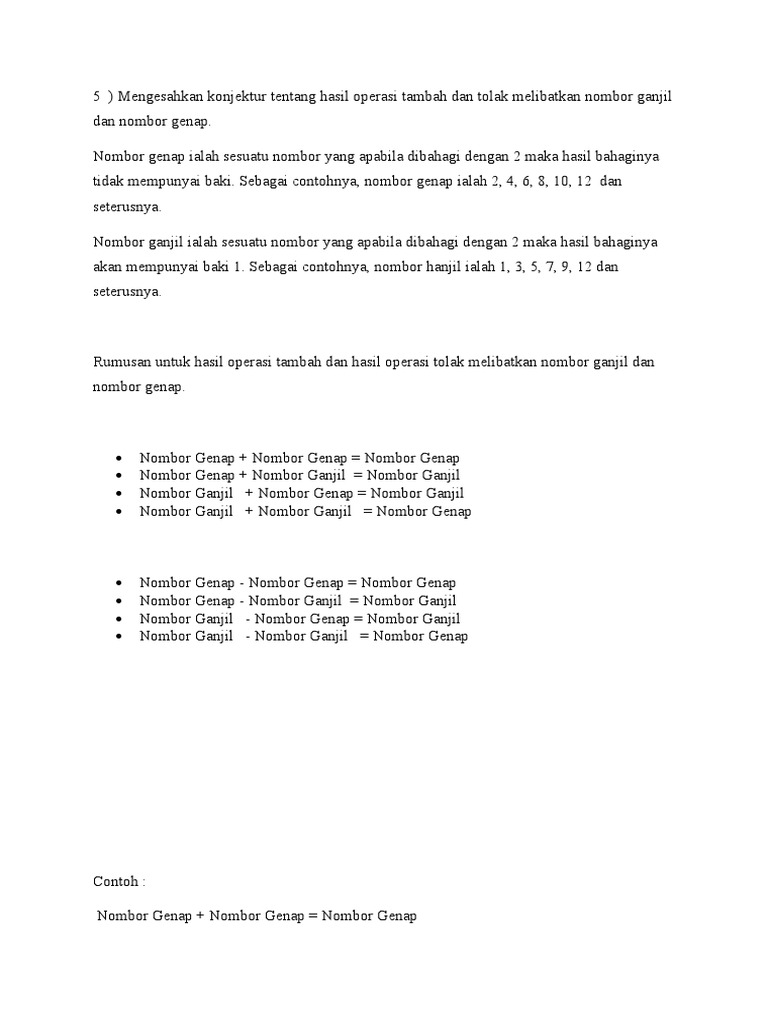 Mari kita simak pembahasan lebih lanjut tentang bilangan ganjil dan genap. Contoh contoh nombor genap ialah 4 8 0 dan 22 manakala contoh contoh nombor ganjil ialah 5 9 3 dan 151. Dalam bidang matematik nombor genap ialah integer yang boleh dibahagi dengan 2 manakala nombor ganjil ialah integer yang tidak boleh dibahagi dengan 2.