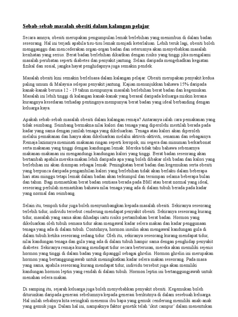 Halaman 1092 bermaksud kegemukan yang disebabkan. Senario terkini kelebihan berat badan dan obesiti di kalangan kanak kanak adalah masalah yang kian meningkat di malaysia menurut statistik yang dikeluarkan oleh persatuan kajian obesiti malaysia maso pada tahun 2005 mencatatkan 27 atau setiap satu dari empat rakyat malaysia dilaporkan mempunyai masalah berat badan yang berlebihan. Sebagai panduan kepada para pelajar di bawah dikongsikan contoh karangan usaha usaha pencegahan masalah obesiti dalam kalangan remaja.