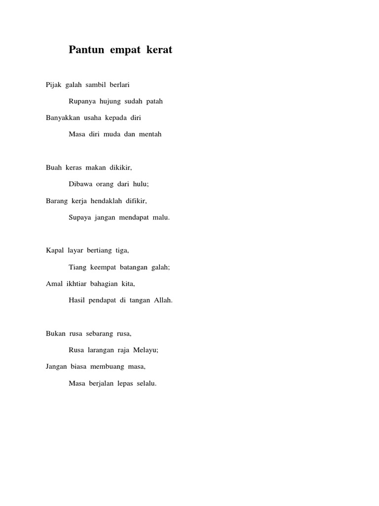 Dengan kesibukan tugas serta perjalanan ke sana ke mari terlepas saya untuk menulis sesuatu sebagai tanda blog just observations ini telah pun menjangkau usia 4 tahun. Semoga perkongsian cara buat pantun 4 kerat bahasa melayu ini bermanfaat kepada anda. Contoh pantun 4 kerat free download as word doc doc docx pdf file pdf text file txt or read online for free.