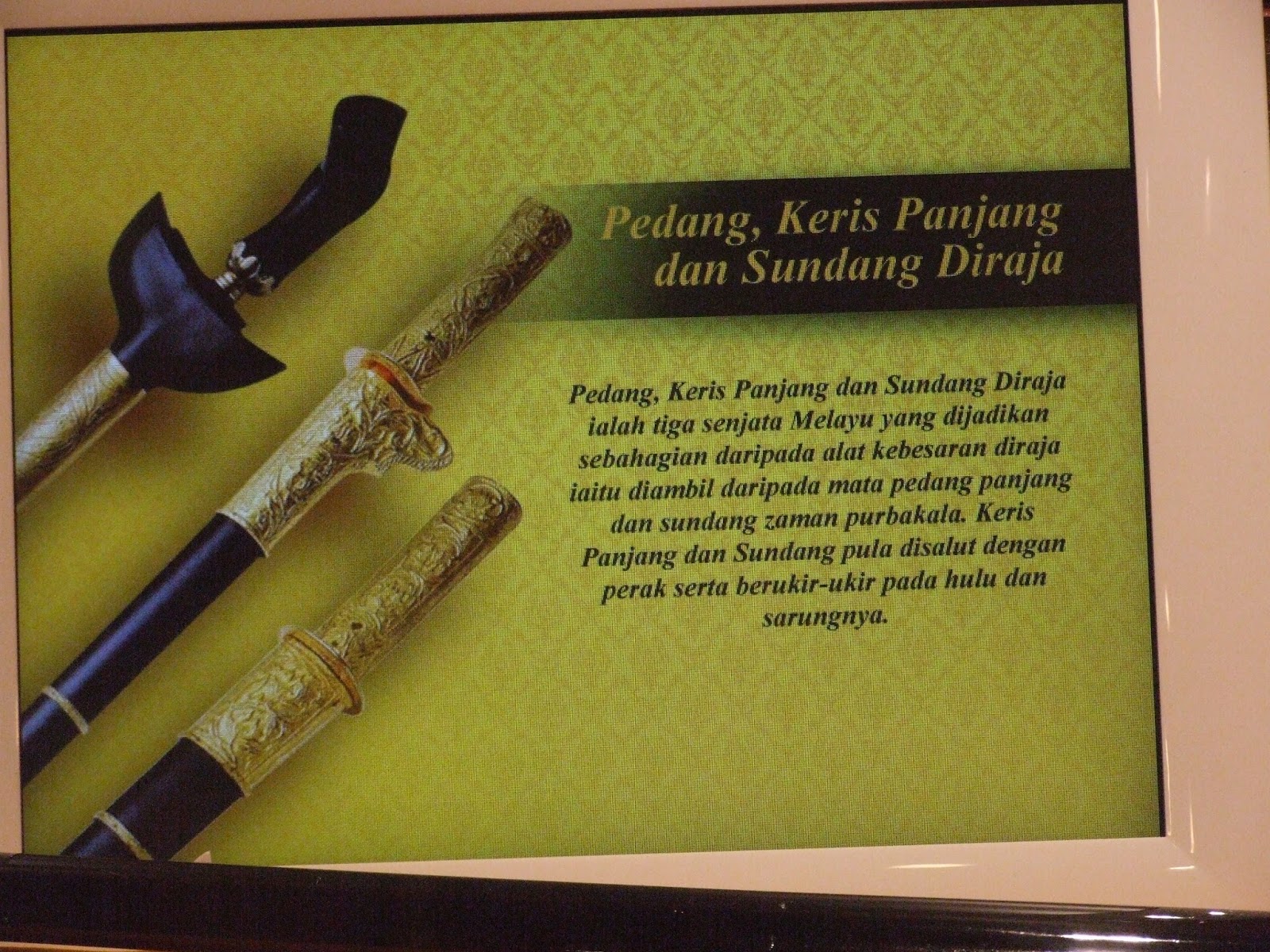 Pedang keris panjang dan sundang diraja. Pedang keris panjang dan sundang diraja alat ini merupakan tiga jenis senjata melayu lama yang diperbuat daripada mata pedang keris panjang dan sundang zaman purbakala keris panjang dan sundang disalut dengan perak dan terdapat ukiran pada hulu dan sarungnya. Keris panjang dan sundang pula disalut dengan perak serta berukir ukir pada hulu dan sarungnya. Peralatan diraja yang turut memainkan peranan penting pada istiadat rasmi ialah 20 kaki payung ubur ubur kuning yang diperbuat daripada kain sutera kuning diraja berpuncak anak bulan dan bintang dan 20 batang tombak berambu berlok tiga yang diperbuat daripada tombak pusaka dari 11 negeri di semenanjung.