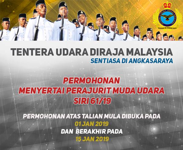 Pengambilan tentera udara 2019. Pengambilan tentera udara diraja malaysia 2019 kini dibuka kepada belia belia malaysia yang berusia tidak kurang daripada 18 tahun dan tidak melebihi 25 tahun berkelayakan dan berminat untuk menyertai tentera udara diraja malaysia anda diperlawa untuk membuat permohonan sekarang. Peluang untuk anda menyertai tentera udara diraja malaysia dalam pelbagai bidang ketenteraan. Temuduga terbuka tudm 2019 ini akan dijalankan secara berperingkat mengikut zon.