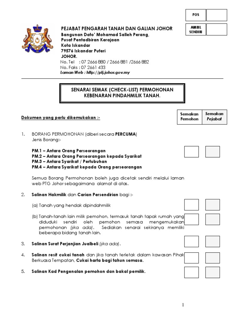 Timbalan pengarah pendaftaran pejabat tanah dan galian johor. Pejabat tanah dan galian perak. Johor bahru johor 80000.