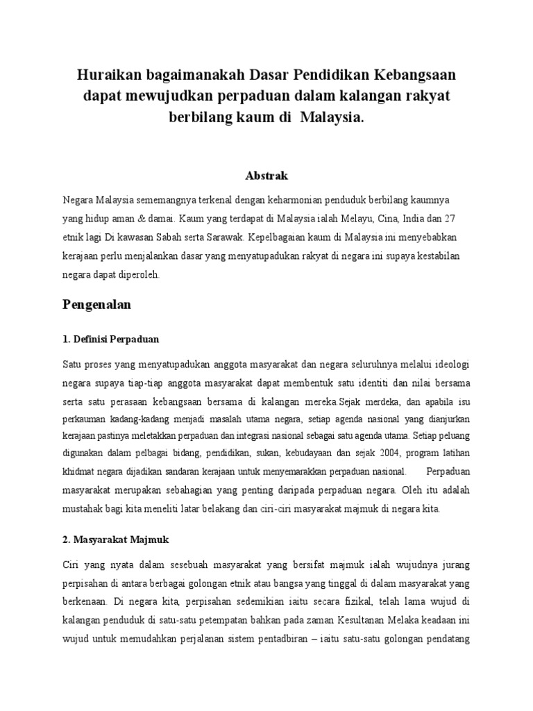 Malaysia merupakan salah satu negara berbilang kaum yang dapat hidup dengan harmoni. Justeru itu kepelbagaian kaum ini haruslah diraikan dan sebagai rakyat malaysia kita perlu saling tolong menolong antara kaum bagai aur dengan tebing untuk sama sama hidup dalam persekitaran hidup yang sihat dan aman makmur. Kepentingan perpaduan kaum 4.