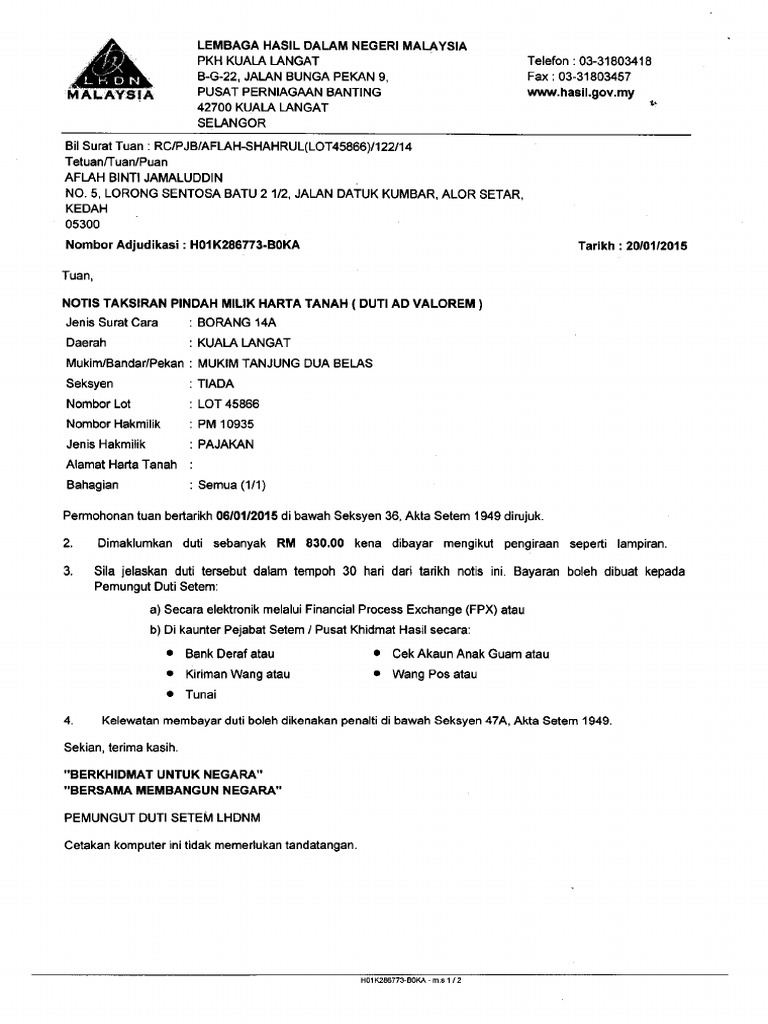 Pengiraan duti setem pindahmilik. Perjanjian jual beli mestilah bertarikh dari 1 1 2019 hingga 31 12 2020. Bahagian duti setem jabatan teknikal tingkat 11 kanan blok 9 kompleks kerajaan jalan duta 50600 kuala lumpur. A 365 2016 walau bagaimana pun ada beberapa syarat yang dikenakan bagi.