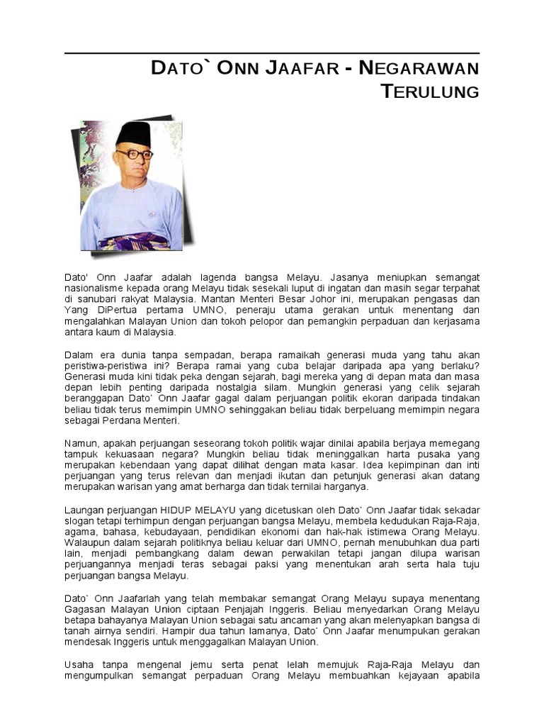 Dato onn bin jaafar adalah salah seorang tokoh yang sangat masyhur dalam sejarah perjuangan kemerdekaan tanah air kita. Dato onn jaafar merupakan orang pertama menyeru orang melayu bersatu padu secara berorganisasi di peringkat nasional. Dato onn bin jaafar born 1895 johor bahru malaya now in malaysia died january 19 1962 johor bahru malayan political figure who played a leading role in the merdeka independence movement and the establishment of the federation of malaya forerunner of the present country of malaysia.
