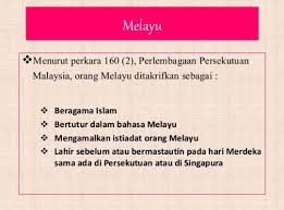 Sekatan mengenai pembuang perkara 136. Perkara 160 2 perlembagaan persekutuan memperincikan definisi melayu sebagai seseorang yang ber agama islam mengamalkan adat dan budaya melayu melazimi pertuturan dalam bahasa melayu dan a lahir sebelum hari merdeka di persekutuan atau di singapura atau ibu atau bapanya telah lahir di persekutuan atau pada hari merdeka itu ia adalah berdomisil di persekutuan atau singapura. 1 ordinan tafsiran dan fasal fasal am 1948 m u.