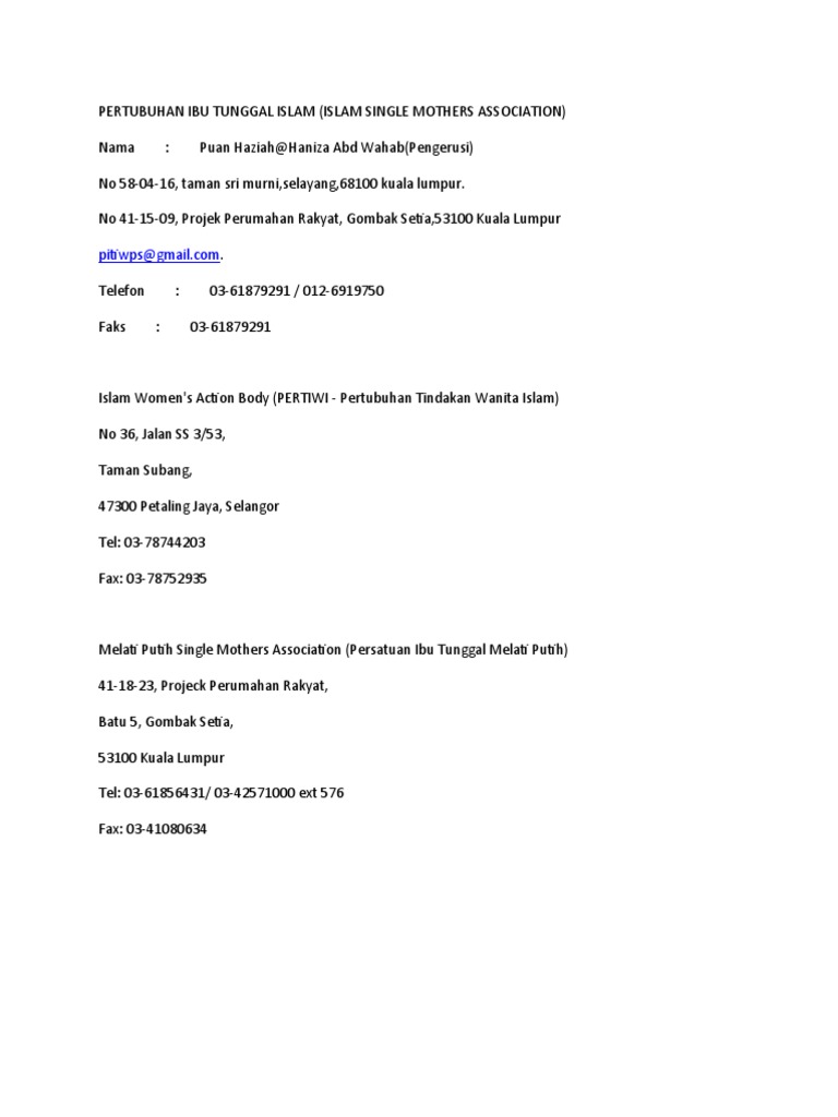 Pertubuhan ibu tunggal islam wilayah persekutuan dan selangor. Ibu tunggal keusahawanan badan amal kebajikan sosial persatuan penduduk taman perumahan persatuan agama kebudayaan persatuan wanita keganasan terhadap wanita selangor 016 6428323. Mpitm kini mempunyai sejumlah lapan belas 18 pertubuhan dan persatuan ibu ibu tunggal dari pelusuk negara yang bernaung dibawahnya.