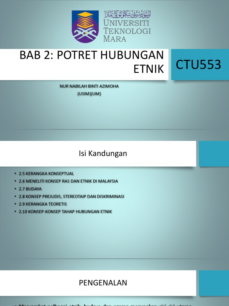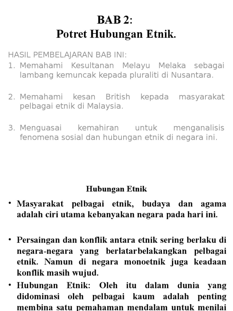Ctu553 potret hubungan etnik group 1 as2532a1 contents 1. Potret hubungan etnik di malaysia negara malaysia dengan kerencaman demografi terus kukuh maju dan membangun malah disegani oleh jiran tetangga dalam konteks negara berbilang etnik. Bab 2 potret hubungan etnik 9 3 2020 mbbs 202005 2 hasil pembelajaran 1 memahami kesultanan melayu melaka sebagai lambang kemuncak kepada pluraliti di nusantara.
