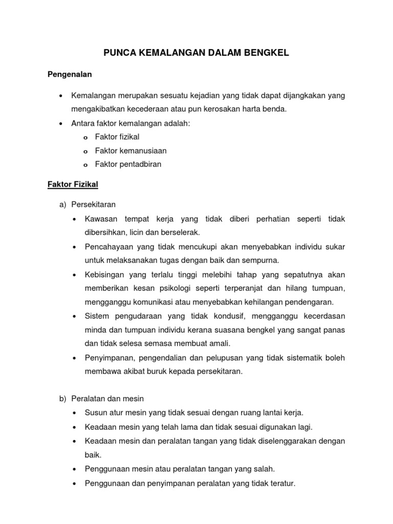 Definisi kemalangan kemalangan merupakan suatu kejadian yang tidak diingini yang disebabkan oleh faktor manusia faktor keadaan persekitaran atau kombinasi lain yang boleh mengakibatkan kecederaan kesakitan kematian atau kerosakan pada harta benda. Mengunakan mesin atau alatan yang rosak. Tidak mematuhi peraturan keselamatan yang ditetapkan.