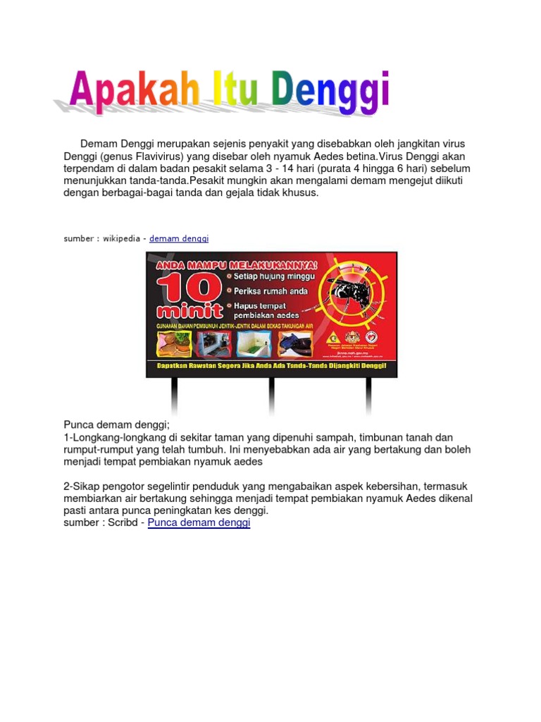 Virus denggi mempunya beberapa jenis iaitu den 1 den 2 den 3 dan den 4. Kesimpulannya kita mestilah bekerjasama bagi membasmi pembiakan nyamuk aedes. 1 longkang longkang di sekitar taman yang dipenuhi sampah timbunan tanah dan rumput rumput yang telah tumbuh.