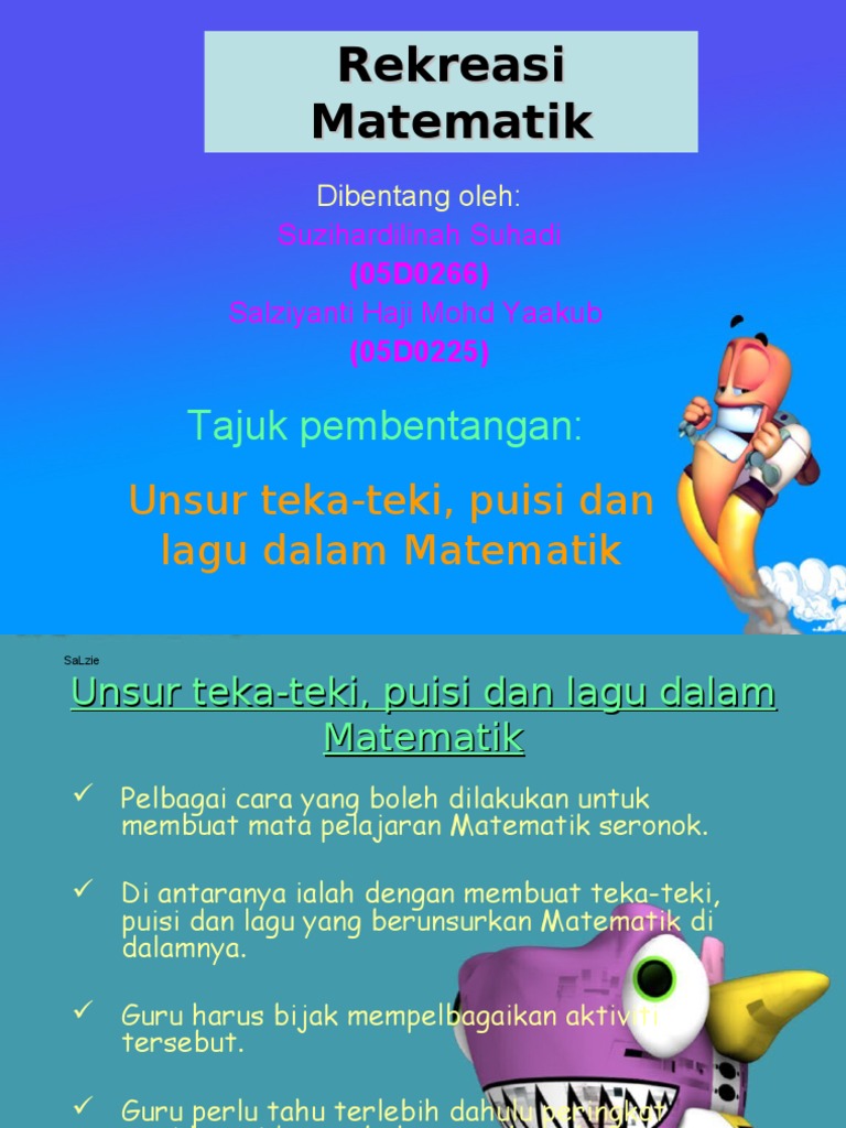 2 3 pengertian matematik rekreasi 16 2 3 1 sejarah matematik rekreasi 19 2 3 2 prinsip prinsip kaedah matematik rekreasi dalam pengajaran dan pembelajaran 20 2 3 3 strategi dalam menggunakan permainan matematik 21 2 3 4 kebaikan kaedah matematik rekreasi 2 3 4 1 kebaikan kepada pelajar 22 2 3 4 2 kebaikan kepada guru 23 2 3 5 contoh matematik. Blog ini dibina untuk memenuhi tugasan 1c teknologi maklumat sekolah rendah upsi semester 2. Rekreasi matematik permainan tipu muslihat kalkulator ghaib hari jadi.