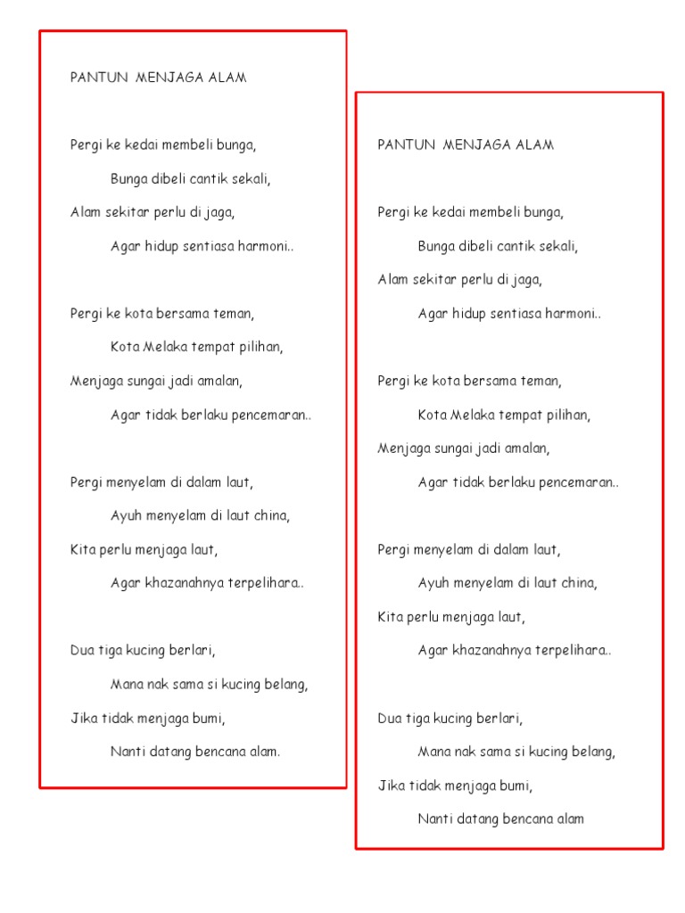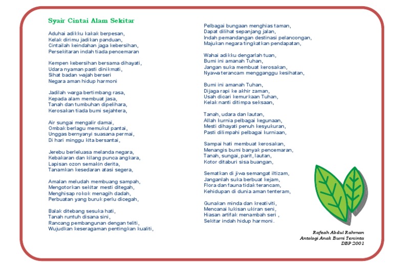 Rpi borang format rancangan pendidikan individu. Sajak alam sekitar alam keindahan mu memukau ramai orang keindahan mu tidak terlawan alam keindahan mu bagaikan syurga air laut yang berombak ombak burung burung berkicau merdu tumbuh tumbuhan yang menghijau. Hasilkan tiga rangkap sajak bertemakan alam sekitar.