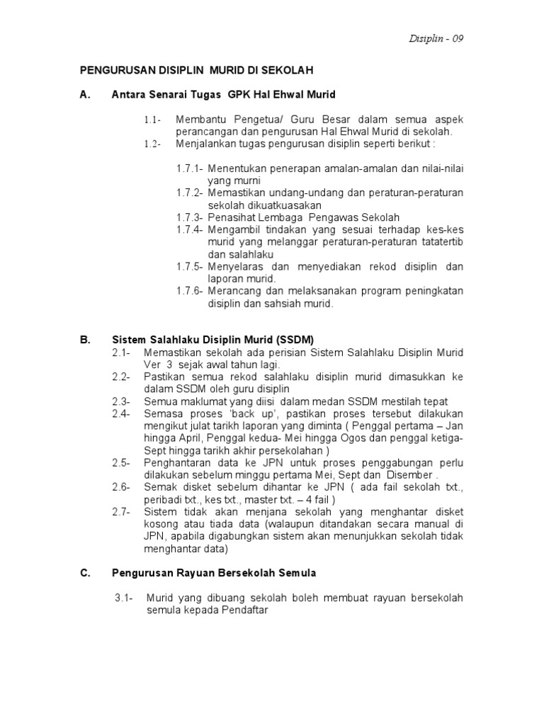 Documents similar to kategori kesalahan sistem salahlaku disiplin murid ssdm. Seseorang murid yang telah melakukan salah laku atau tingkahlaku yang mengganggu berulang ulang kali dan didapati tidak berubah selepas tindakan memulihnya diambil oleh guru besar atau tingkah lakunya mendatangkan gangguan yang serius kepada murid murid lain dan terhadap keseluruhan disiplin sekolah tindakan yang sesuai diambil ialah mengarahkan pembuangannya dari sekolah. Senarai nama menteri 2012.