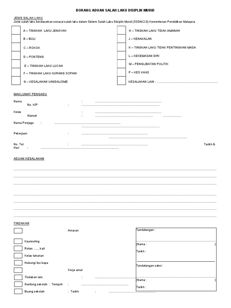 Salah laku kurang sopan dan biadab 1 berkelakuan kasar terhadap guru 2 berkelakuan kasar terhadap pengawas 3 berkelakuan kasar terhadap murid 4 berbahasa kesat 5 menyimpan rokok 6 menghisap rokok 7 mengganggu pengajaran dan pembelajaran 8 tidak menghormati guru 9 tidak menghormati pengawas salah laku kekemasan diri 1. Contoh surat akuan disiplin murid senarai semak fail rmt. 1 2 seseorang murid yang telah melakukan salah laku atau tingkah laku yang mengganggu berulangkali dan didapati tidak berubah selepas tindakan memulihnya diambil oleh pengetua guru besar atau tingkah lakunya mendatangkan gangguan yang serius kepada murid murid lain dan terhadap keseluruhan disiplin sekolah tindakan yang sesuai diambil ialah mengarahkan pembuangannya dari sekolah.