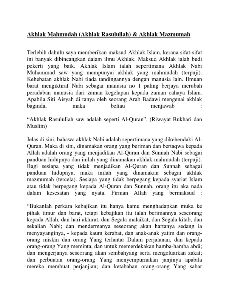 Pengertian akhlak mahmudah dan madzmumah akhlak merupakan sifat yang menyatu dalam diri manusia sehingga dia akan melakukan sesuatu dengan reflek tanpa ada intruksi. Akhlak biasanya menunjukkan tabiat yang baik sehingga setiap orang wajib memilikinya. Sifat membawa maksud kelakuan tindakan akhlak aktiviti fizikal dan hati manakala mahmudah pula membawa erti sesuatu yang dianggap dan dizahirkan sebagai yang terpuji dan cantik pada pandangan mata dan hati manusia secara fitrah dan estetika.