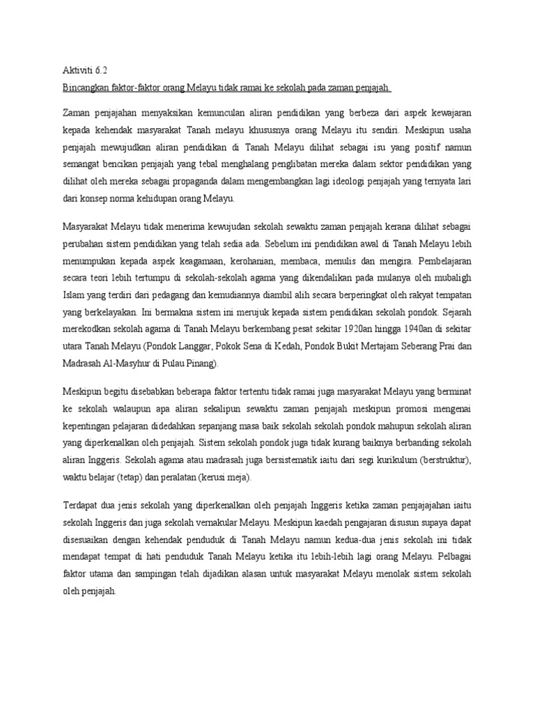Sistem pendidikan semasa penjajahan british. 3 0 sistem pendidikan semasa penjajahan british 3 1 perkembangan sekolah vernakular melayu 1786 1941 sistem sekolah vernakular hanya diperkenalkan mulai dari pertengahan kurun ke 19 apabila kerajaan british mula mengambil perhatian terhadap pendidikan di negeri negeri selat. Contohnya di pondok langgar pokok sena di kedah pondok bukit mertajam seberang prai dan madrasah al masyhur di pulau pinang. 1 3 2 impak dalam bidang ekonomi semasa penjajahan british sistem pendidikan yang berasaskan dasar pecah dan perintah telah mendatangkan impak dalam bidang ekonomi.