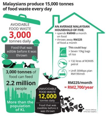 Secara keseluruhannya semua jenis sisa makanan terbuang yang. Rakyat malaysia menghasilkan kira kira 37 890 tan sisa setiap hari dengan sekurang kurangnya 1 17 kilogram kg dijana bagi setiap individu. Setiap hari kira kira 3 000 tan metrik sisa makanan yang pada asasnya tidak disentuh dan masih boleh dimakan telah dibuang oleh isi rumah dan jumlah itu adalah mencukupi untuk memberi makan dua juta orang yang kelaparan.