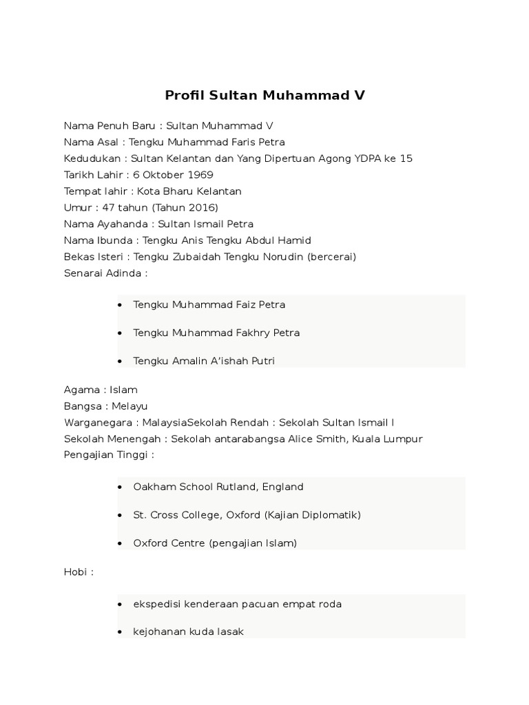 Nama bekas isterinya ialah tengku zubaidah tengku norudin. Tengku muhammad faris petra bergelar kdymm sultan muhammad ke v. Sultan muhammad v is a devout muslim who has undergone rigorous.