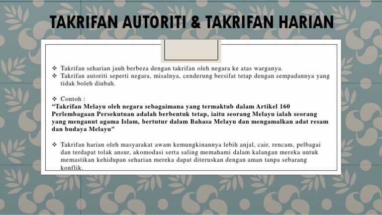 Takrifan harian everyday defined jauh lebih penting dan berkesan daripada struktur atau institusi yang bersifat takrifan autoriti authority defined kerana setiap anggota masyarakat majmuk adalah bebas untuk bertindak dan berprilaku prokeamanan prokeharmonian dan antikeganasan demi survival diri keluarga dan kelompok sosialnya. Takrifan melayu dalam kepada perlembagaan berbahasa melayu agama islam dan amal budaya melayu. Memberi takrifan autoriti tumpuan bersifat tetap.