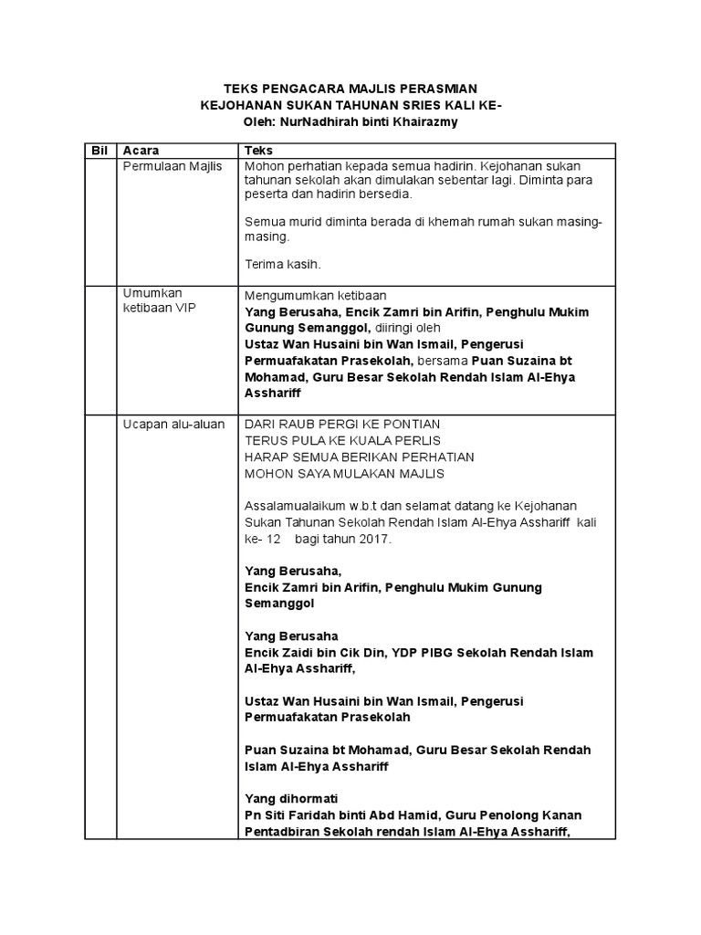 Teks pengacara majlis hari sukan. Amin di atas ucapan perasmian itu tadi dan setinggi tinggi penghargaan kerana sudi merasmikan kejohanan olahraga sk lktp pasir raja kali ke 28. Seterusnya majlis ingin menjemput guru besar mengiringi encik chen kuen khiong encik sim teck hwa dan encik alex lee untuk menjadi saksi bagi pembacaan ikrar hari sukan. Untuk mendownload teks pengacara majlis boleh klik link dibawah.