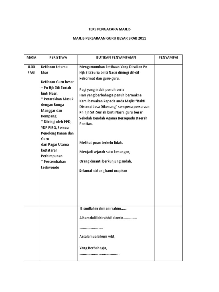 Teks pengacara majlis persaraan guru. Skrip juruacara majlis persaraan guru penolong kanan nasa2k. Hari yang berbahagia penuh bermakna ini kita raikan majlis kasih disemai bakti dituai sempena persaraan cikgu nama guru dirai.