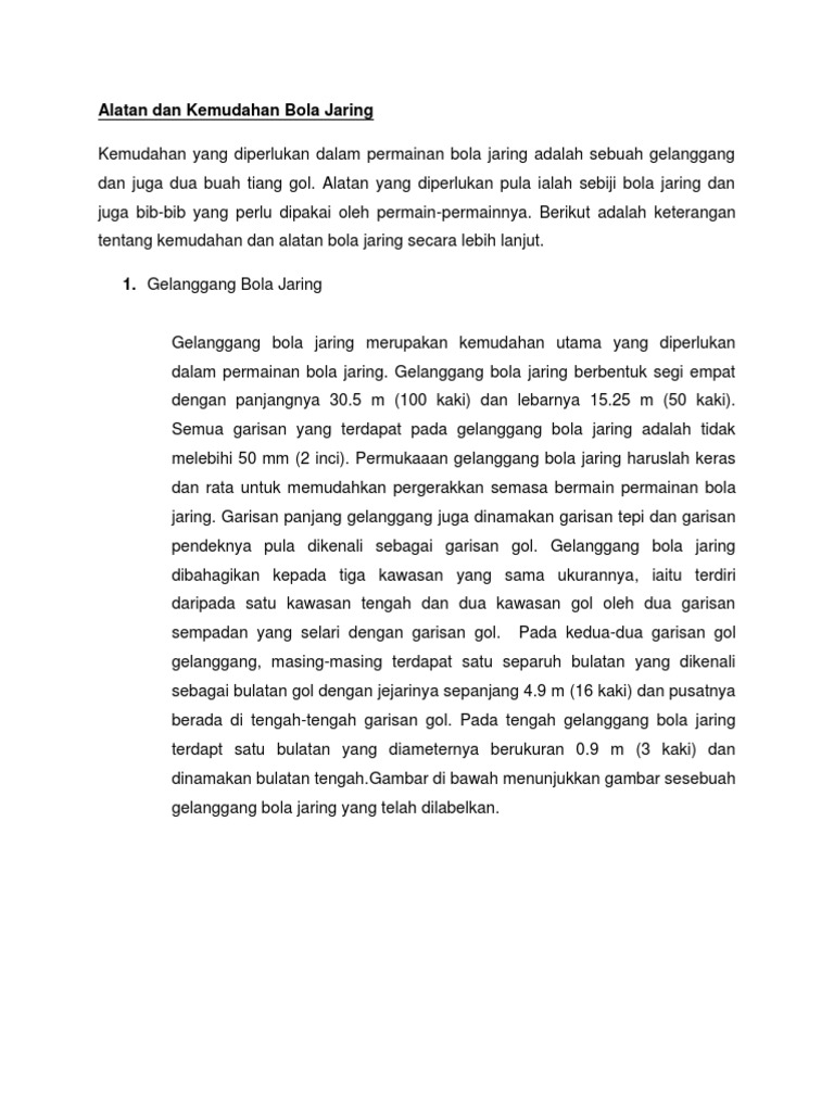 Ukur lilit bola adalah lebih kurang 99sm 102sm dan beratnya dianggarkan seberat 6 35 7 26 kg perlu disemak. Tiang gol bola jaring tidak mempunyai papan latar seperti tiang gol bola keranjang. Bola ini diperbuat daripada kulit atau getah.