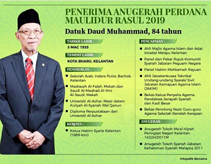 Sementara itu empat penerima anugerah maulidur rasul peringkat kebangsaan 2019 pula ialah ahli akademik prof datuk dr asma ismail. Beliau yang lebih dikenali sebagai cikgu azmi. Tema majlis sambutan maulidur rasul adalah ummah rabbani negara harmoni iaitu tema yang sama dengan tema sambutan maal hijrah.