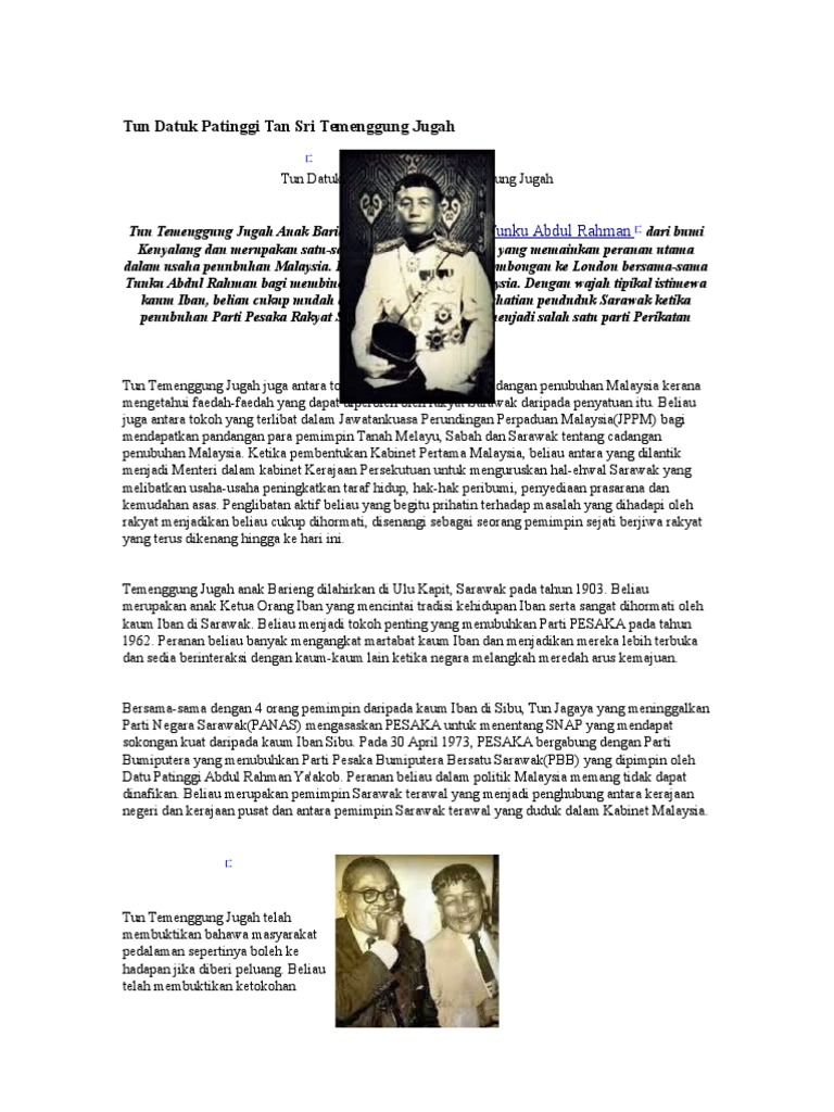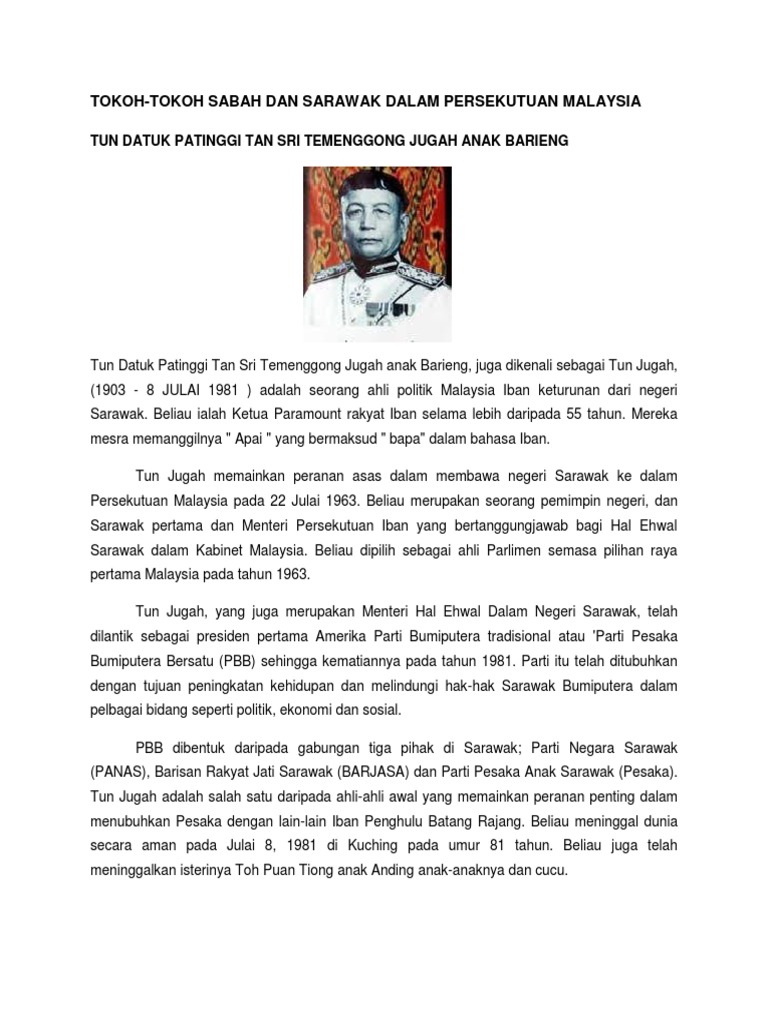 Cerita lucu tentang temenggong jugah anak barieng pada 19 2 2016 jumlah. Beliau menganggotai jawatankuasa perundingan perpaduan malaysia. Tun datuk patinggi tan sri temenggung jugah anak barieng atau juga dikenali sebagai tun jugah atau apai dilahirkan di ulu kapit sarawak pada tahun 1903.