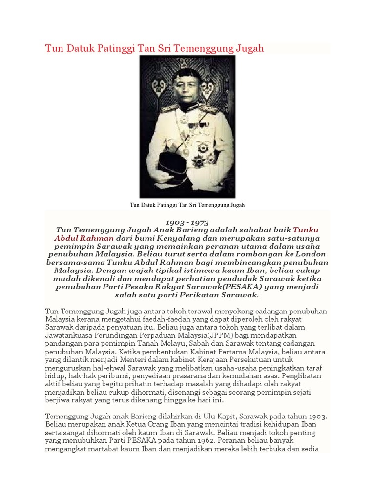Temenggung jugah menyokong cadangan penubuhan malaysia. Kapit is the birthplace of sarawak s most famous iban chief temenggong jugah anak barieng better known as tun jugah 1903 1981. He played a fundamental role in bringing the state of sarawak into the federation of malaysia in 22 july 1963.
