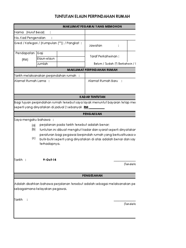 Borang tuntutan elaun perpindahan rumah. Tuntutan perpindahan rumah dalam stesen yang sama ketua jabatan pegawai pengawal ketua jabatan yang bererti pegawai pengawal satu satu kementerian atau jabatan bagi meluluskan tuntutan elaun elaun kerana perpindahan rumah. Senarai semak borang tuntutan elaun perpindahan rumah lampiran a surat pengesahan alamat rumah yang dibeli di bawah skim pinjaman perumahan kerajaan lampiran b borang akuan keluar kuarters lampiran c surat kelulusan pinjaman perumahan perbendaharaan.