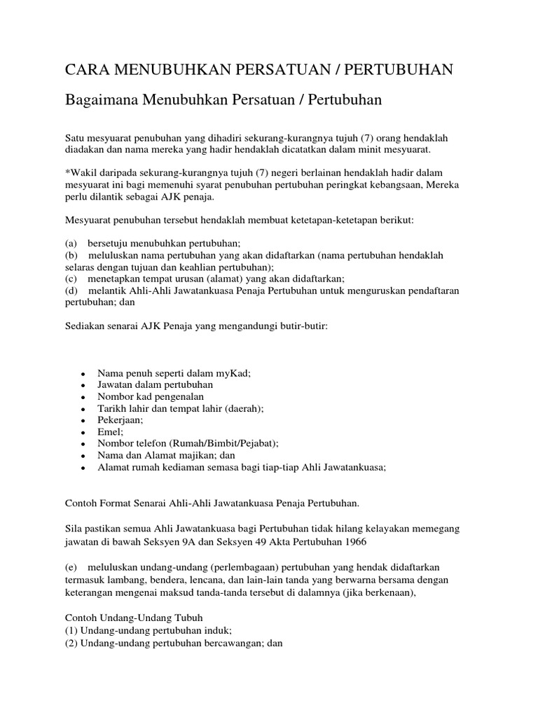 Permohonan untuk perubahan atau pindaan kepada undang undang persatuan hendaklah dibuat kepada pendaftar pertubuhan dalam masa 60 hari daripada tarikh keputusan mesyuarat agung meluluskan perubahan atau pindaan itu dan hanya boleh dikuatkuasakan mulai daripada tarikh perubahan atau pindaan itu diluluskan oleh pendaftar pertubuhan. Pertubuhan yang tidak wujud lagi di bawah seksyen 13 1 c v. Objektif mewujudkan jalinan kerjasama dengan pertubuhan yang berdaftar di bawah jppm serta memberikan khidmat nasihat dan kefahaman berkaitan pengurusan pertubuhan selaras dengan akta pertubuhan 1966 peraturan 1984 termasuklah perlembagaan yang diwujudkan oleh sesebuah pertubuhan.