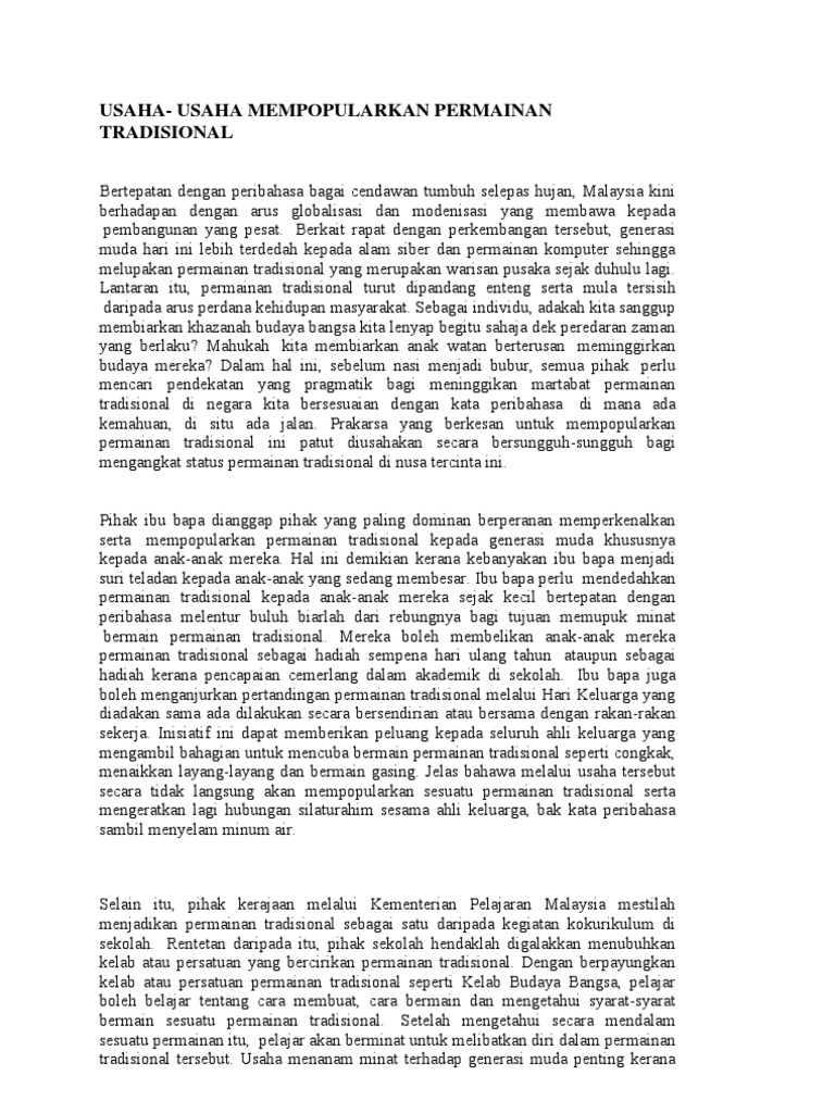 Oleh itu peranan masyarakat amat penting dalam usaha mempopularkan permainan tradisional. Semua pihak haruslah bersama sama membantu dapat memelihara warisan nenek moyang kita ini dan tidak boleh mengharapkan sesetengah pihak sahaja yang menjalankan peranan mereka. Langkah mengekalkan permainan tradisional.